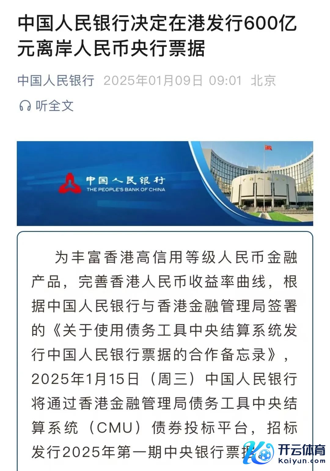 为丰富香港高信用等第东说念主民币金融产物,完善香港东说念主民币收益率弧线,字据中国东说念主民银行与香港金融惩办局签署的《对于使用债务器用中央结算系统刊行中国东说念主民银行单据的迎合备忘录》,2025年1月15日(周三)中国东说念主民银即将通过香港金融惩办局债务器用中央结算系统(CMU)债券投标平台开云体育(中国)官方网站,招标刊行2025年第一期中央银行单据。