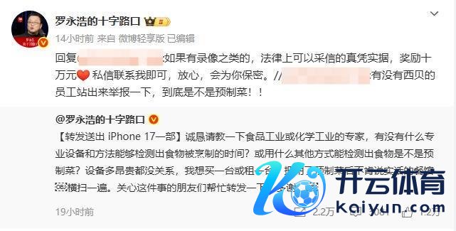 对此,罗永浩再次发微博回复称“准备好了”,后又发微博默示“碰到蠢东谈主心累”。而在此之前,罗永浩还赏格10万元公开搜集西贝使用预制菜的真凭实据。
