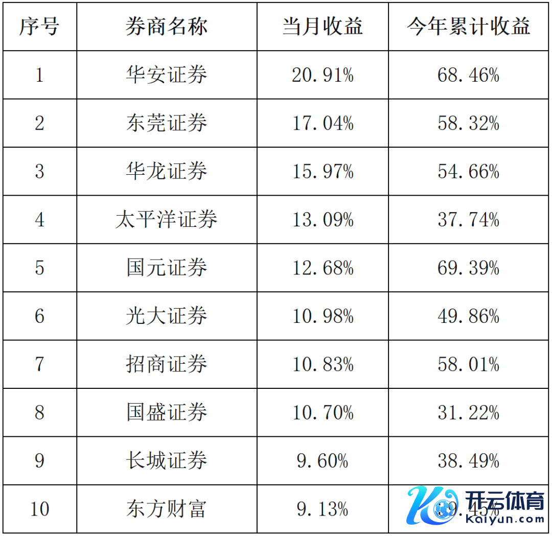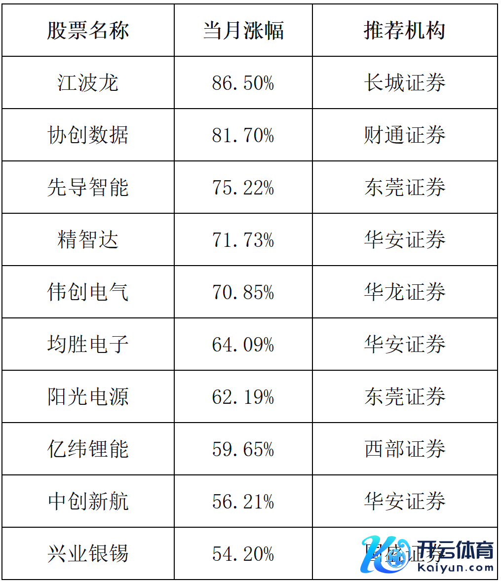 在9月金股中,长城证券推选的江波龙当月高潮了86.5%,涨幅居于当月金股榜首;财通证券推选的协创数据9月涨幅达到81.7%,名按序二;东莞证券推选的先导智能以75.22%的月涨幅位居第三。